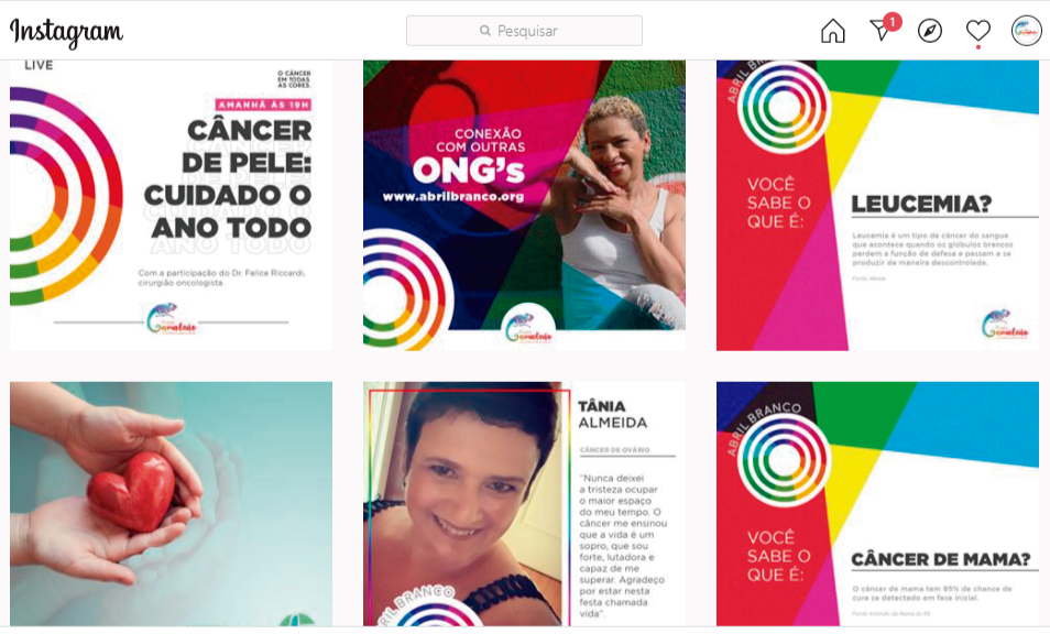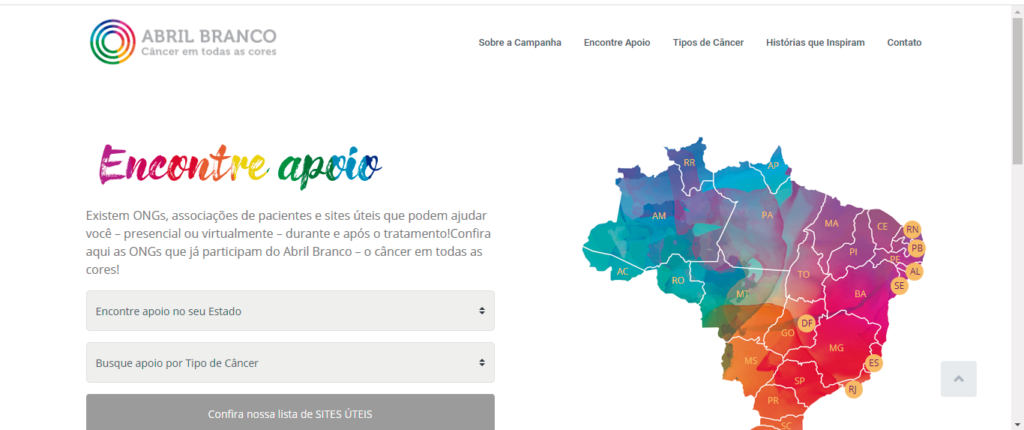 Já em 2019, além da campanha nas redes sociais, também lançamos o site Abril Branco, com o objetivo de trazer ainda mais conscientização e união entre os pacientes. No site, que está no ar o ano inteiro, você pode conferir um vasto material sobre o câncer (seus sinais e sintomas, diagnóstico e tratamento) e ler histórias inspiradoras de quem recebeu o diagnóstico. Além disso, criamos uma seção especial onde você pode pesquisar onde encontrar apoio em outras ONGs – tanto por tipo de câncer quanto por localização no Brasil.